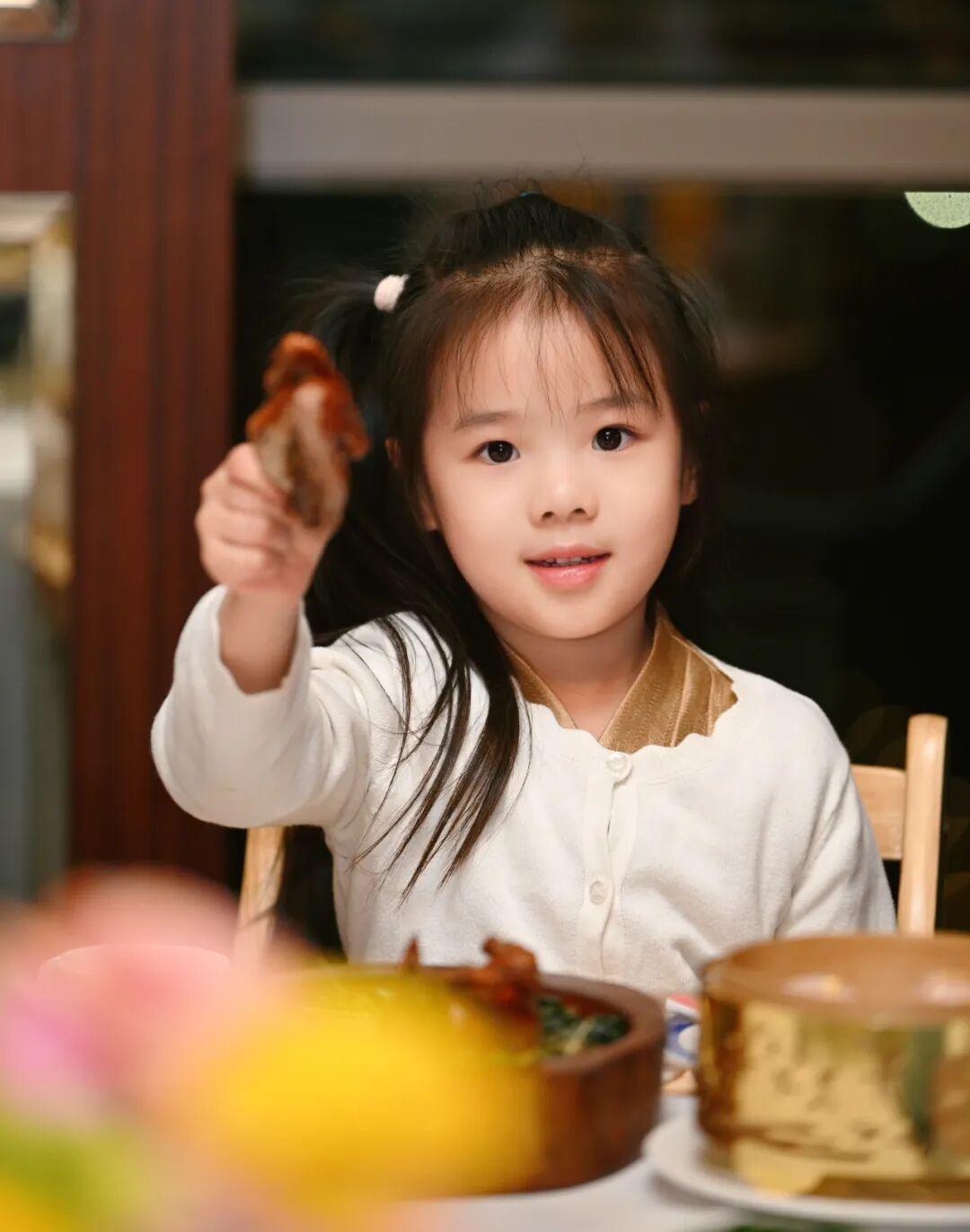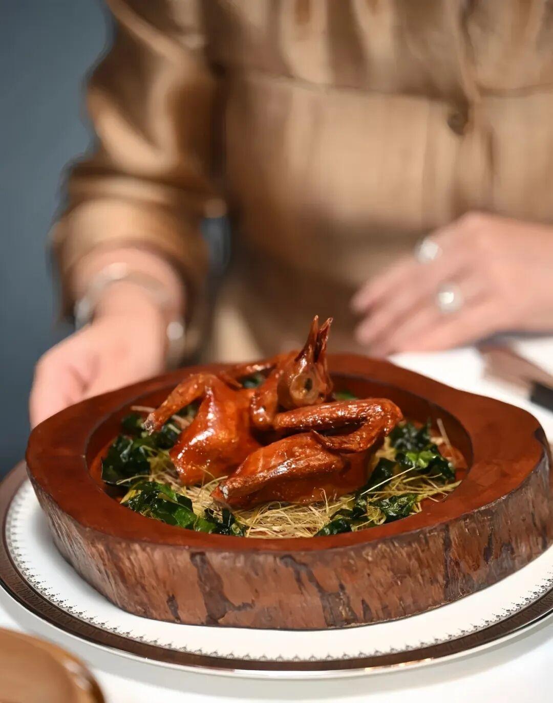 最最招牌的是「金雀報喜」,即果木煙燻香茅燒乳鴿,很多食客專程來巴黎軒就爲這道鴿子。上桌時自帶“仙氣”,揭蓋瞬間香茅與蘋果木的煙燻香氣撲面而來。乳鴿皮脆肉嫩,咬下去汁水豐盈,是大人小孩都無法抗拒的經典美味,咩咩和兔兔都忍不住一人喫了一大塊。咩咩喫完後還特意誇讚說“皮是脆的”~