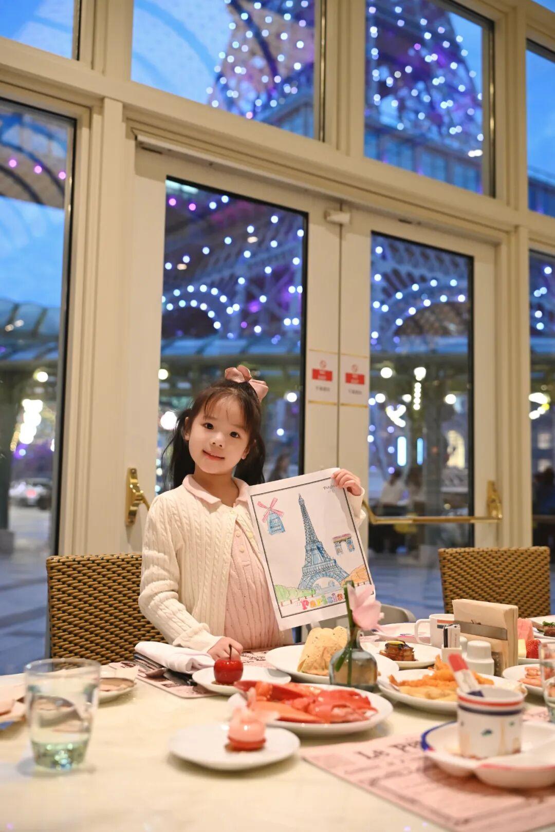 餐廳位於巴黎人主樓1樓,環境寬敞明亮,以凡爾賽宮風格裝飾爲主,水晶吊燈、穹頂壁畫、噴泉雕塑營造出法式宮廷奢華氛圍,落地窗外還能看到巴黎鐵塔的景色,咩咩還畫了她最喜歡的鐵塔。