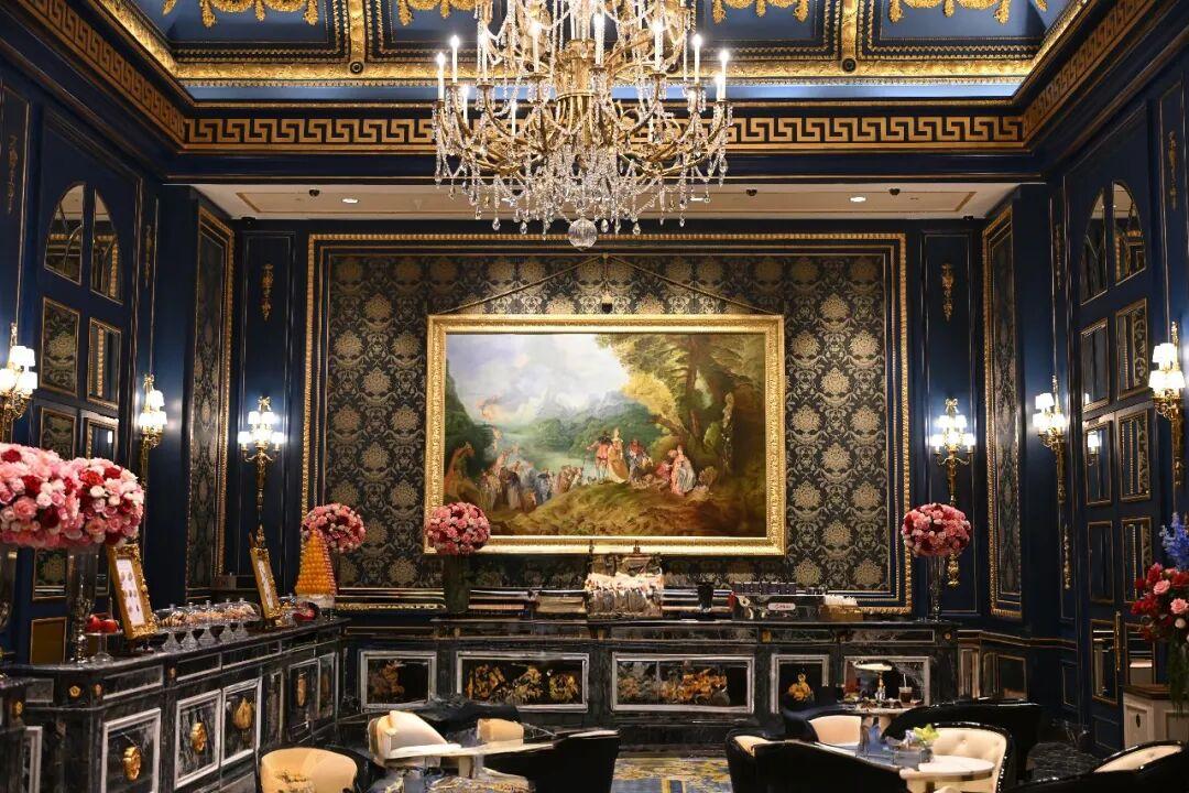 整個空間以濃郁的法式宮廷風格裝潢,藍色鎏金的穹頂繪有古典油畫,巨型水晶吊燈從高處垂落,隨處可見巴洛克式的金色雕花、柱頭、大理石紋理和華麗壁畫,彷彿一步跨進路易十四時代的鏡廳。