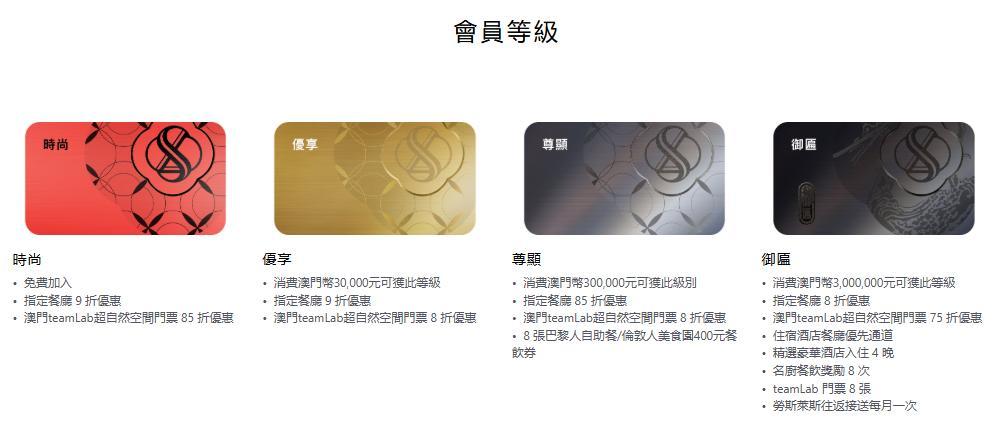 當你年累積消費滿3萬澳門元,就可以從新註冊時的“時尚級”進階爲“優享級”。這個門檻對於家庭出遊來說確實非常友好,組合更是多種多樣。