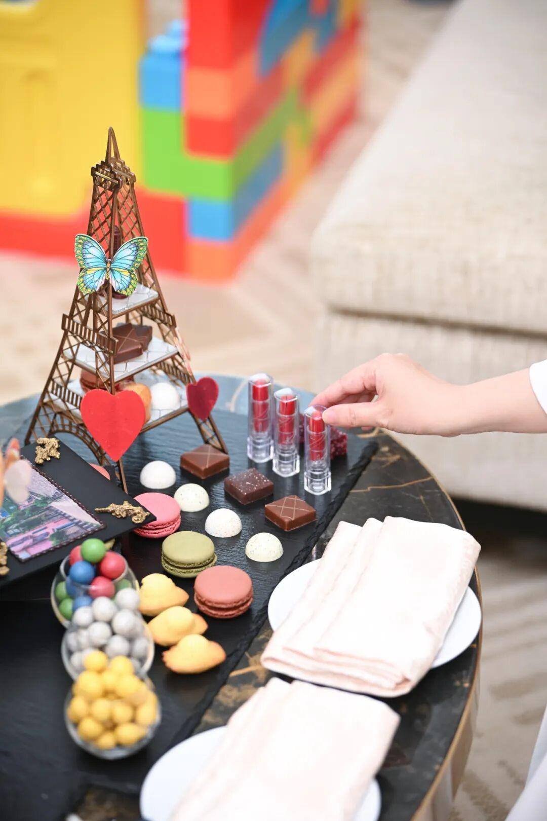 咩咩和兔兔最愛好喫又好看的糖果大禮,金色鐵塔變身點心架,蝴蝶繞着“紅色熱氣球”起舞,有着“夢想啓航”的好寓意。最吸睛的是紅彤彤的“平安果”,代表着“你最珍貴”,用小木槌敲開,滿滿都是驚喜。