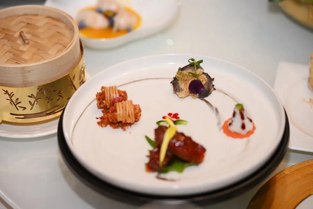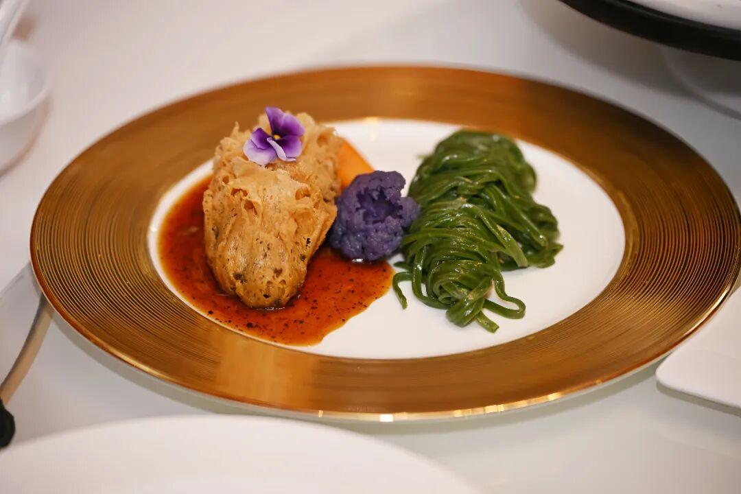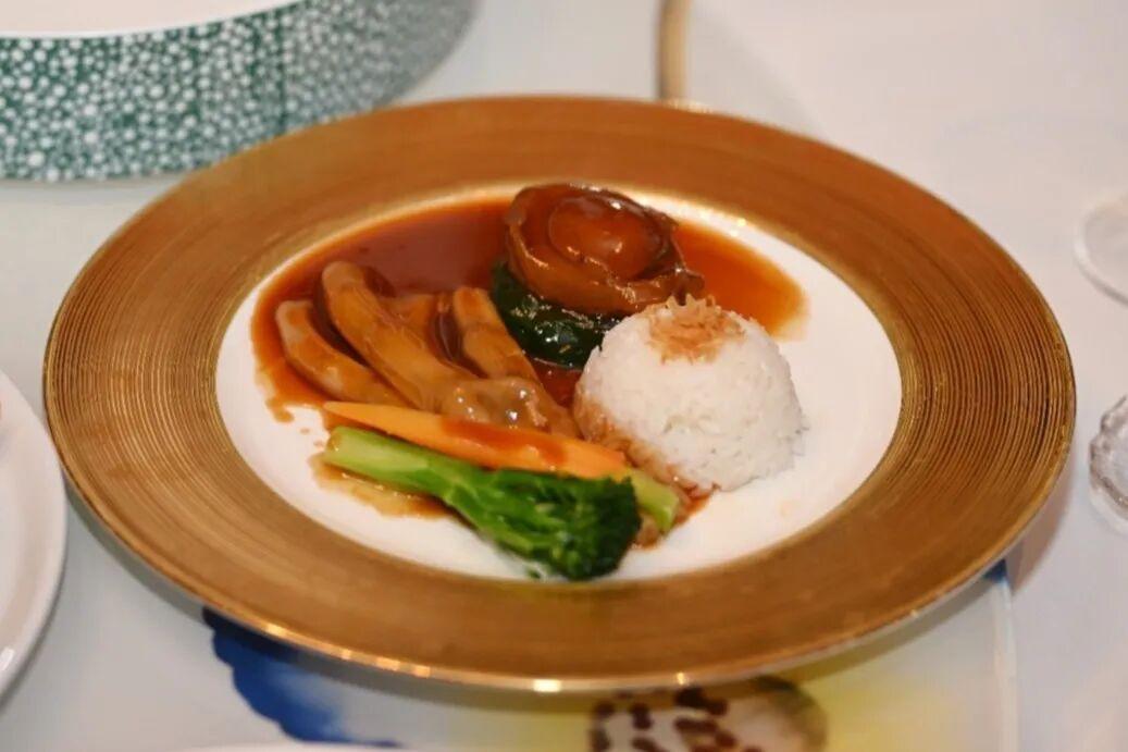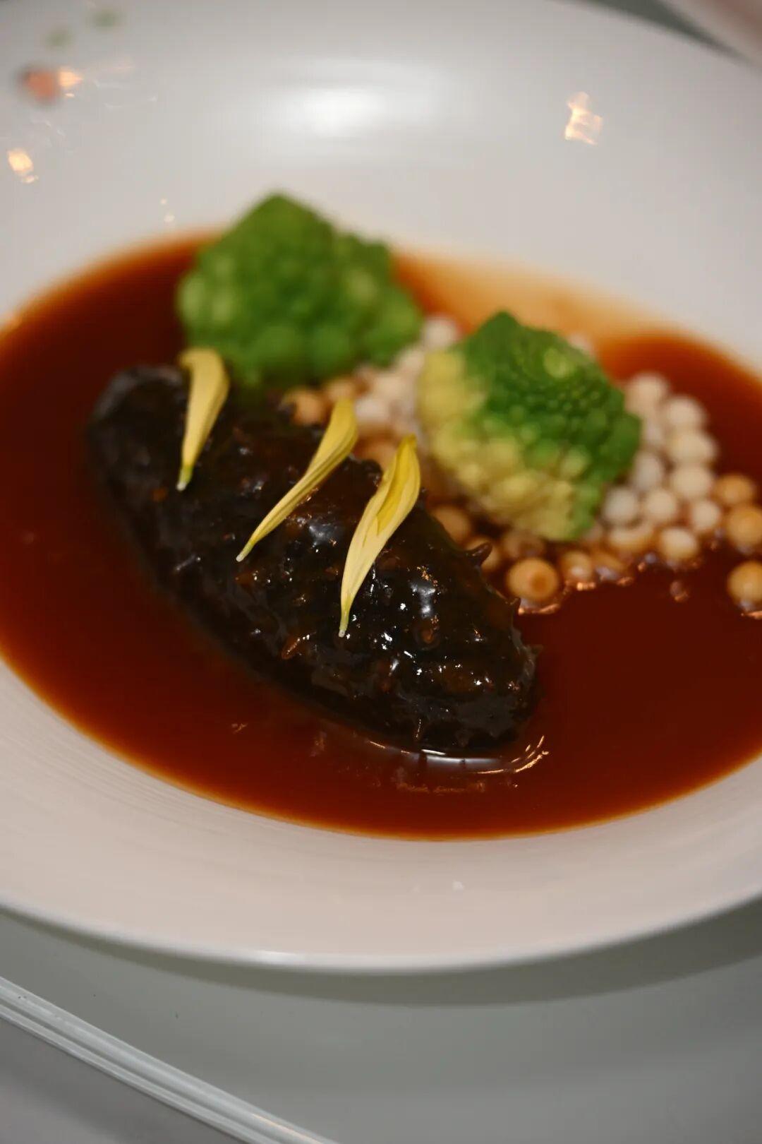 黑松露玉簪龍蝦球,整隻龍蝦頭昂揚立於盤中,很有“龍馬精神”。龍蝦肉以蘆筍穿過,搭配黑松露的獨特幽香與炸過的脆米,口感鮮甜彈牙且層次豐富;老陳皮蟹皇蟹肉釀遼參伴鮮芡實,選用名貴的遼參,內部釀入鮮美的蟹肉與蟹皇,最點睛之筆是加入了老陳皮熬製的醬汁,陳皮的甘香完美化解了蟹黃的膩,風味獨特。
