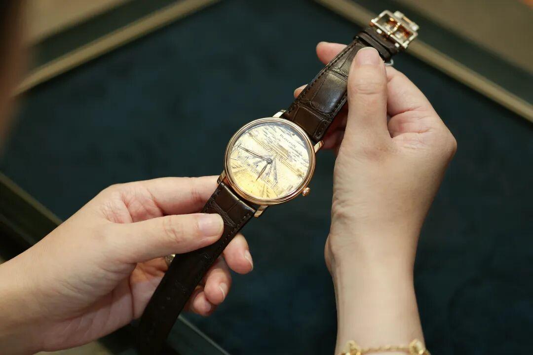 寶珀“鎮店之寶”藝術大師系列,一般的店鋪都難得一見。我鑑賞的這款以故宮爲主題,大師在錶盤上雕刻出宮殿的大氣與恢弘,隨着光線變化,地面磚瓦的細節纖毫畢現,立體感極強,極具視覺衝擊力。這類腕錶產量極低,每一枚都是孤品,被形容爲“將時間化作藝術”,非常適合作爲傳家寶收藏。