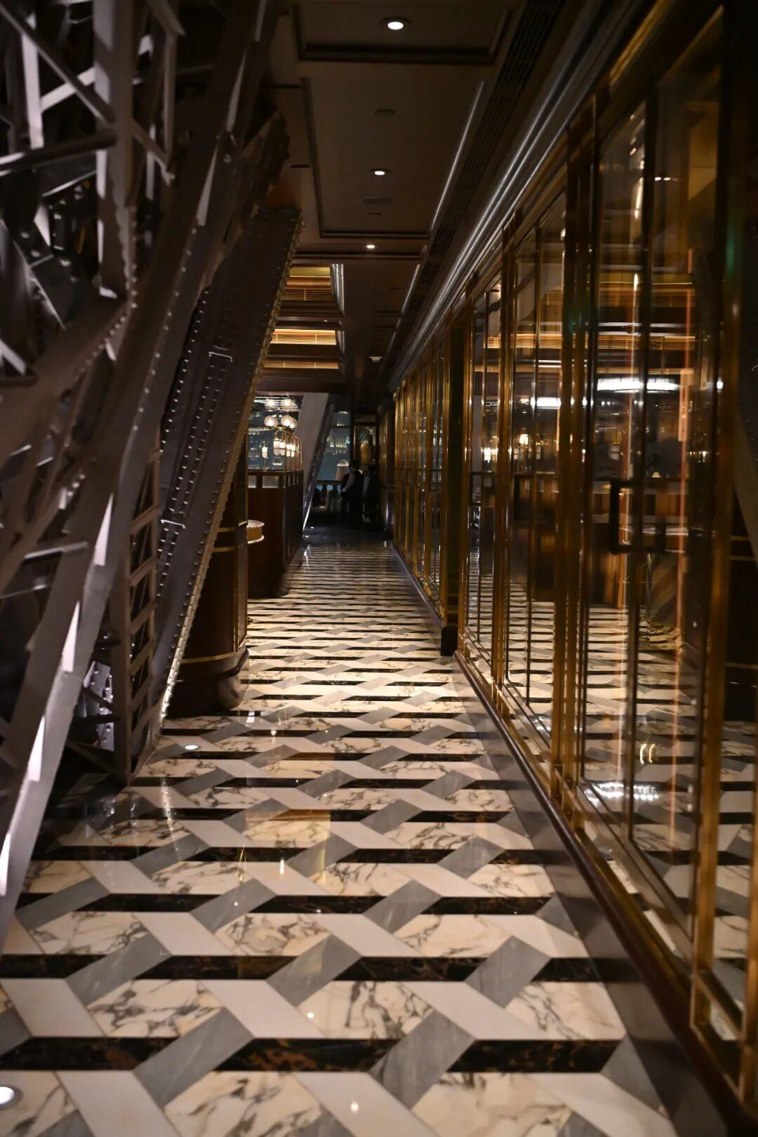 巴黎軒的入口隱祕,需要先到達巴黎人購物中心5樓的專屬接待處,在禮賓員的引導下,通過一條玻璃連廊,轉乘專用電梯直達餐廳。連廊本身就是一道風景線,玻璃牆幾乎360度透明,懸浮在巴黎鐵塔的鋼結構之間,行走其間彷彿置身於《盜夢空間》的夢境通道。