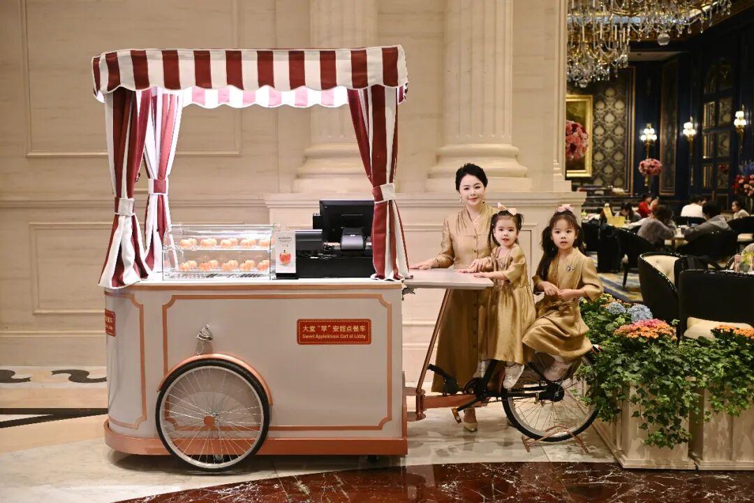 大堂裏還停着極具復古風情的“蘋”安甜點餐車,咩咩兔兔迫不及待地坐了上去,瞬間變身小小甜點推銷員~