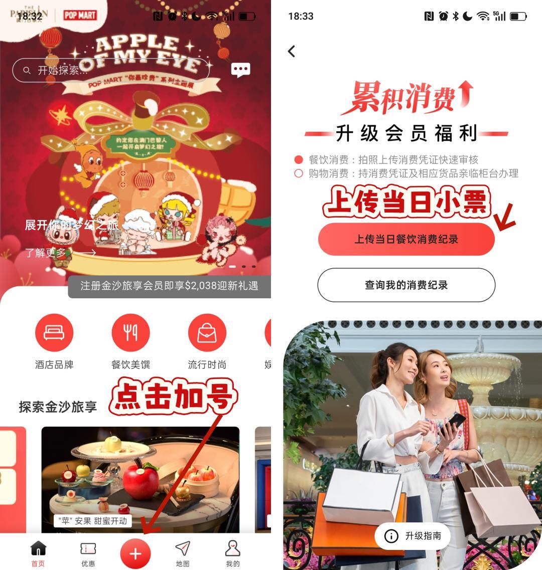 操作方法也很簡單,只需三步:打開金沙旅享APP → 點擊首頁下方的加號 → 上傳當日餐飲消費記錄,非常方便。