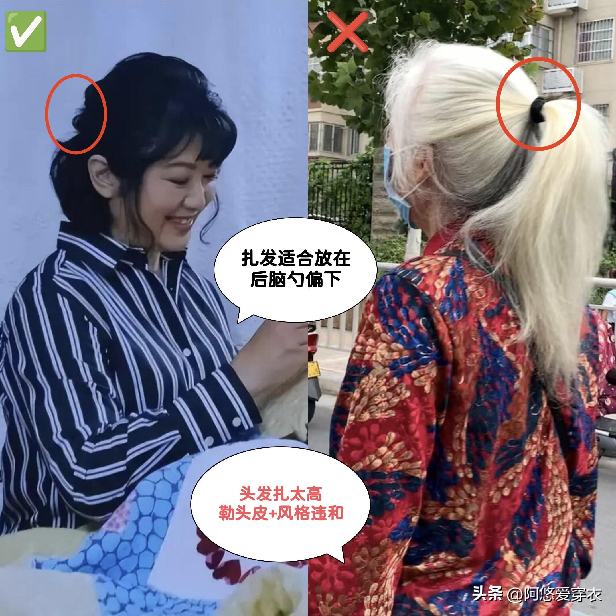 大家扎發的時候千萬不能扎太高太緊,不然會勒頭皮而且風格也跟我們的年齡不搭。我更推薦大家去選低馬尾或低髮髻,耳朵前面還可以特意留出兩縷頭髮,用捲髮棒做一個自然的C字或S型弧度,你去試試就知道這樣有多好看了~