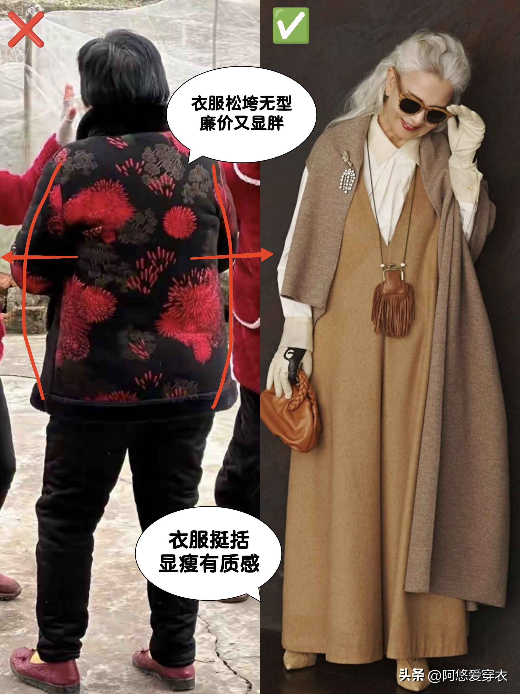 而很多大齡女性說起來身材還比山口百惠更瘦,偏偏愛穿左邊這種大紅大綠的衣服。主要是這些顏色太鮮亮了,和我們老了暗沉發黃的皮膚一比,就顯得我們非常疲憊。如果你選的還是雪紡、蕾絲等容易顯廉價的材質,那就更精緻土了!