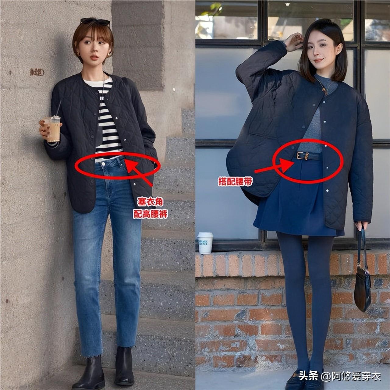 與此同時,腰線也是一個很重要的分割點,爲什麼好多人穿棉襖都容易顯得五五開?就是因爲腰線的位置被擋住了,全身被厚重的衣服包裹着,確實很難優化比例。
