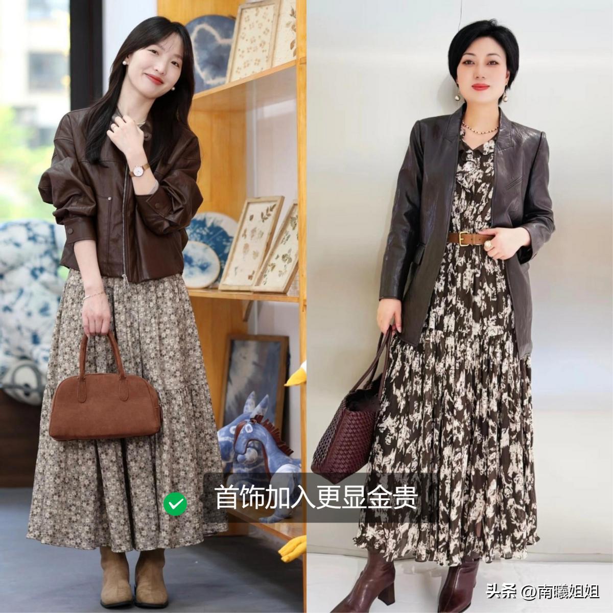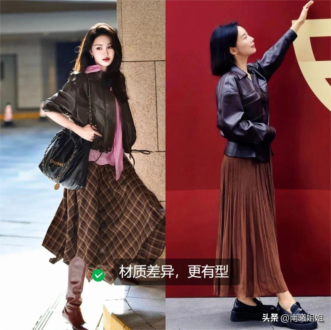 疊穿誰都會,但把不同“脾氣”的衣服穿在一起,纔是真本事,春天別隻會上衣加外套,試試讓“軟的”和“硬的”、“休閒的”和“正式的”來個對撞。比如一件短款軟皮夾克,裏面配一條雪紡碎花連衣裙,皮的“颯”和碎花的“柔”混在一起。這種強烈的材質對比,能讓搭配立刻跳出平庸,顯得你特別會穿,還非常有層次感。