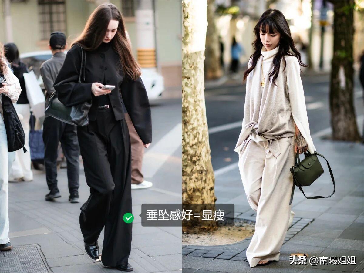而褲裝的選擇別買那種硬邦邦像工作服,買帶點羊毛或者天絲的,摸上去軟,垂下來直。褲子要買稍微有點寬鬆的直筒褲,長度最好能蓋住一點鞋面,走起路來帶風,特別顯腿直腿長。