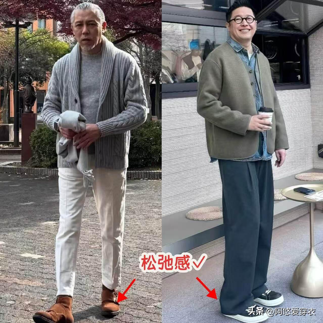 穿皮鞋看着光鮮亮麗,其實難受的只有自己,不但會磨腳、擠腳,還會加重你的老年感,顯得特別的油膩;所以穿老錢褲的時候,大家可以試着換一些舒適和時尚並存的鞋子,比如短靴搭配九分褲,長褲搭配帆布鞋,舒適和時髦兼顧。