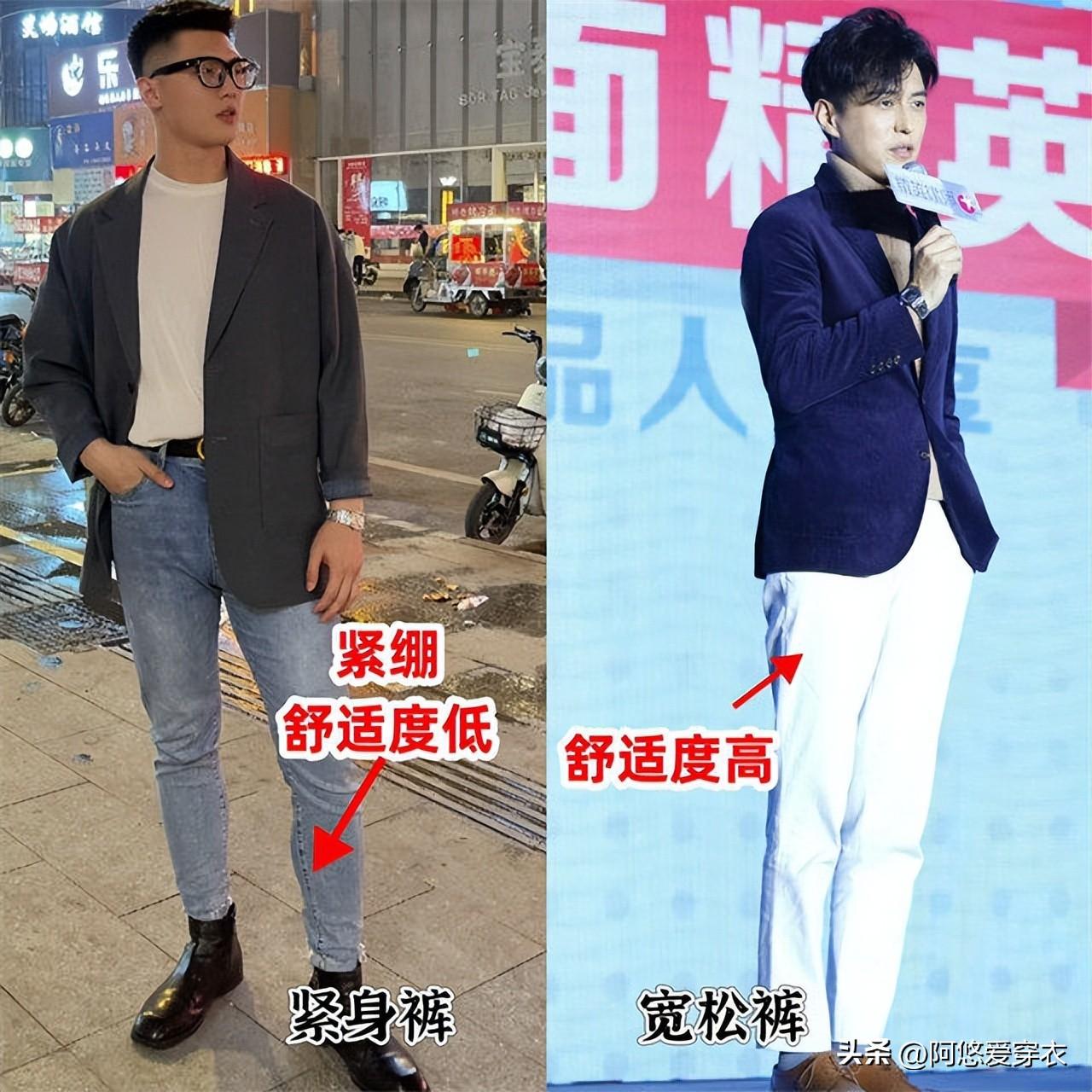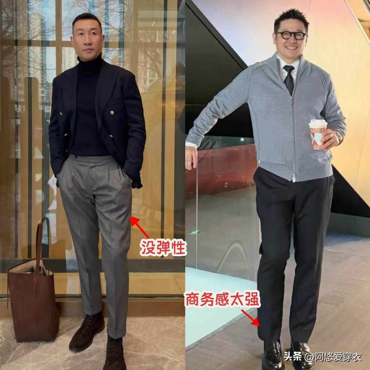 從舒適度來看,西裝褲的材質缺乏彈性,穿在身上很容易勒得慌,要是腿粗一點更是穿不出時尚感,再從時尚感來看,西裝褲配皮鞋也顯得極其的油膩,特別容易展現出一種老幹部的氣息。