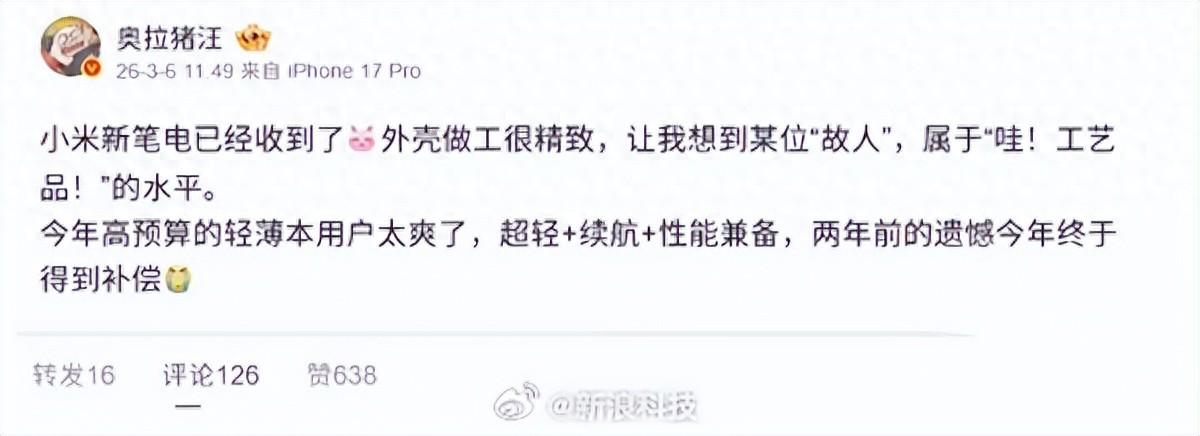 據該博主透露,小米新一代筆記本的外殼做工極其精緻。其工藝水準甚至讓人聯想到某些頂級的工業設計典範,被評價爲達到了工藝品級別的質感,開箱瞬間的視覺衝擊力極強。