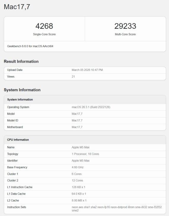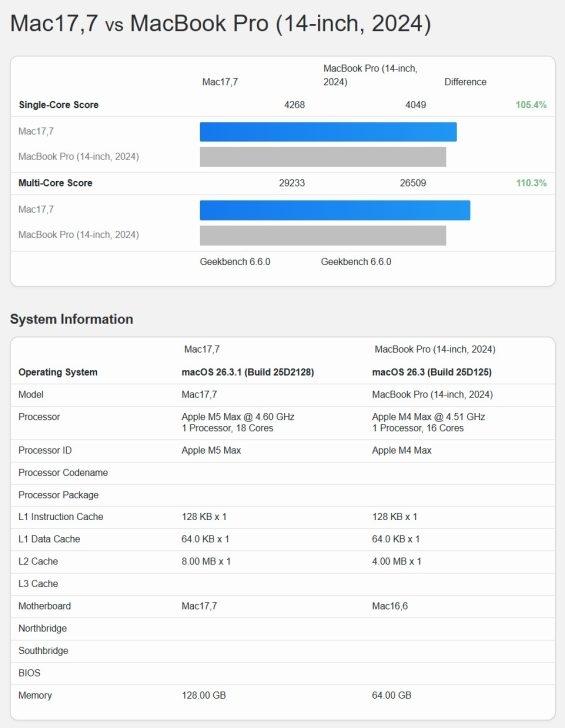 M5 Max單核得分4268分,較M4 Max的4049分僅提升5.4%;多核得分29233分,較M4 Max的26509分提升10.3%,這一提升幅度對於期待性能大提升的用戶來說,或許會感到失望。