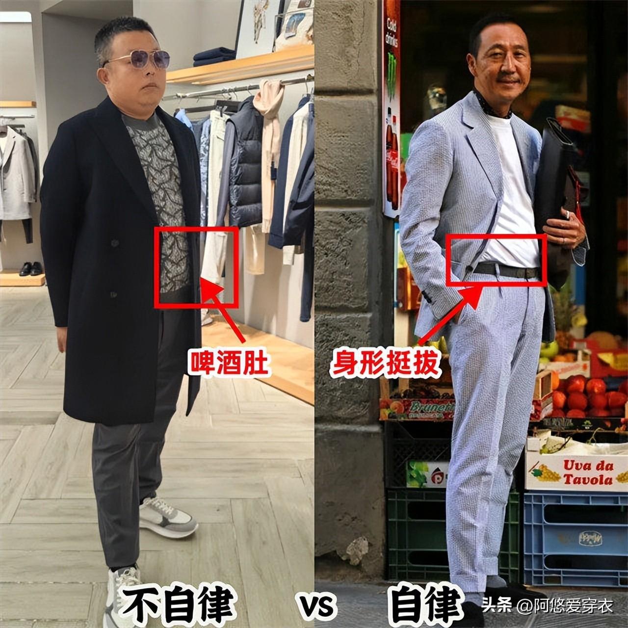 所以,男人到了中年之後真的不能再放縱自己了,如果飲食和運動都忽略了的話,很容易發福,到時候想要再改變自己的形象可是很費時費力的,像下面這個大叔,放縱時和自律時的狀態差距是不是很大?要是不想變成他放縱時的模樣,就得管住嘴和邁開腿。