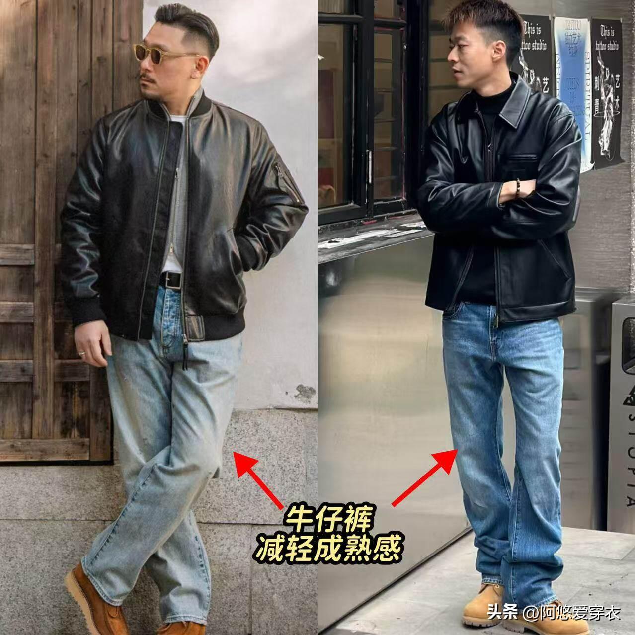 皮衣本身帶有成熟、硬朗的氣質,若是再搭配西褲和皮鞋,可能會顯得有點嚴肅,如果是日常搭配的話,咱們就可以換成休閒風的褲裝,比如下面的這些男性,混搭牛仔褲中和了皮衣的硬朗,看着酷颯有型,還具有減齡的效果,輕輕鬆鬆打造 “雅痞風”,適合追求潮流的成熟男性。