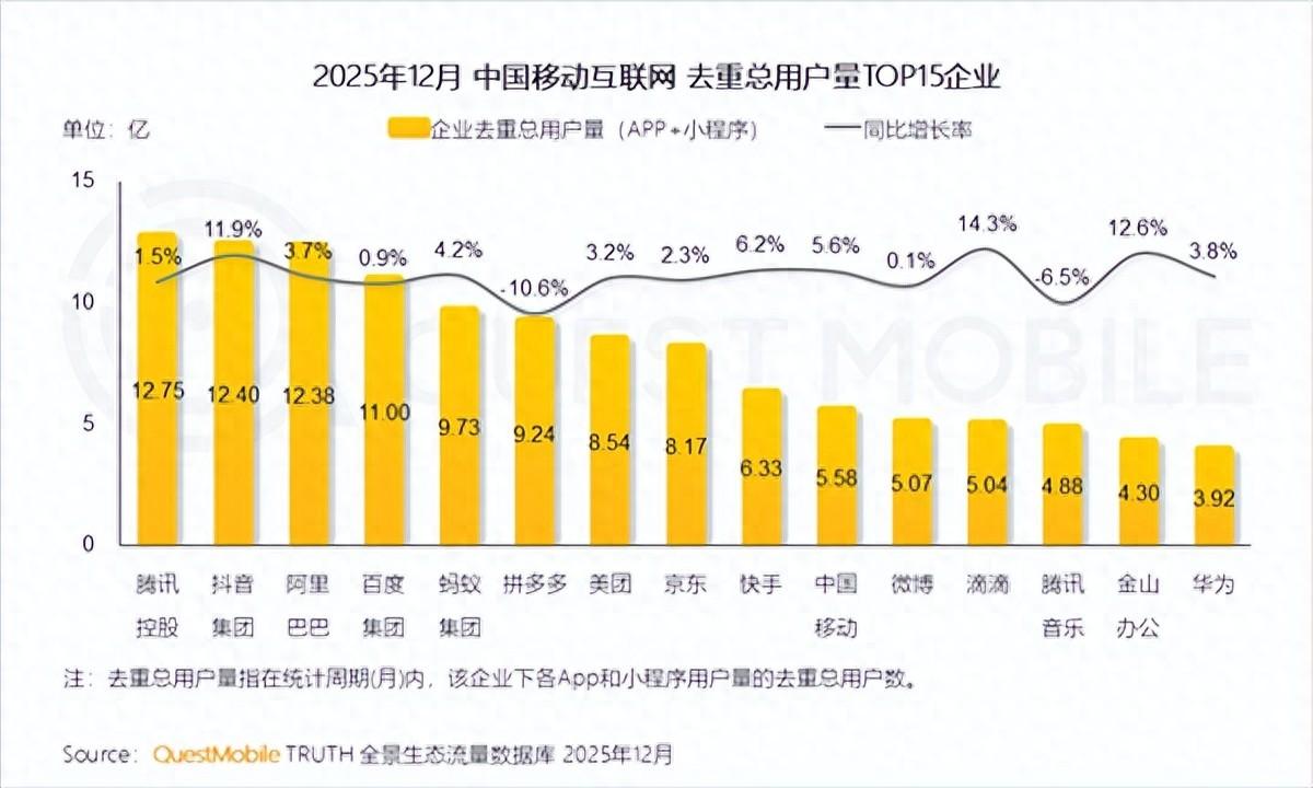從用戶規模來看,騰訊控股以12.75億的去重總用戶量位居榜首,抖音集團以12.40億緊隨其後,阿里巴巴則以12.38億位列第三。