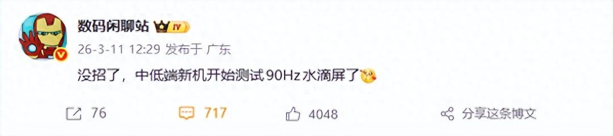 今日,數碼博主“數碼閒聊站”透露,已經有手機廠商的中低端新機開始測試90Hz水滴屏了。