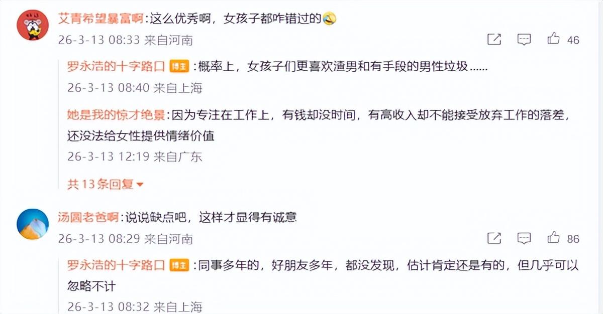 對於這則徵婚真實性,有網友調侃 “這麼優秀爲何還單身”,羅永浩直言不諱:概率上,女孩子更喜歡渣男和有手段的男性垃圾。