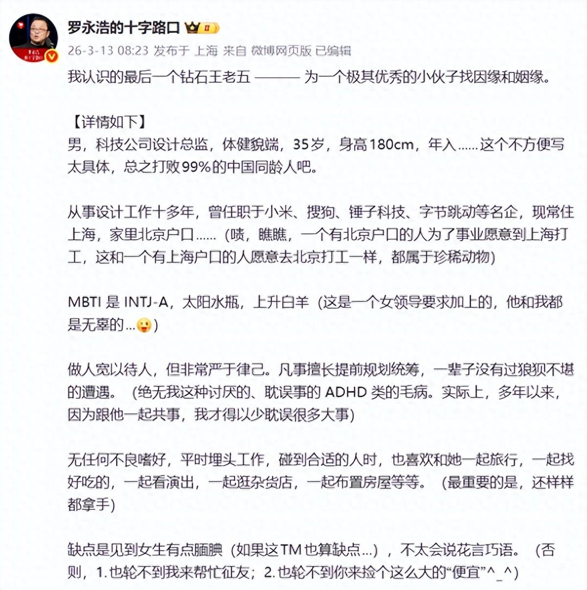 快科技3月13日消息,羅永浩今日在個人社交平臺,爲身邊最後一位鑽石王老五公開徵婚,引發網友熱議。