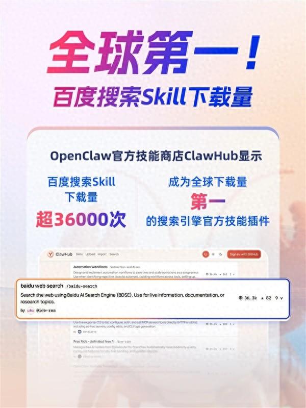 快科技3月13日消息,今天,OpenClaw官方技能商店ClawHub數據顯示,百度搜索Skill以超36000次的下載量,成爲該平臺全球下載量第一的搜索引擎官方技能插件。