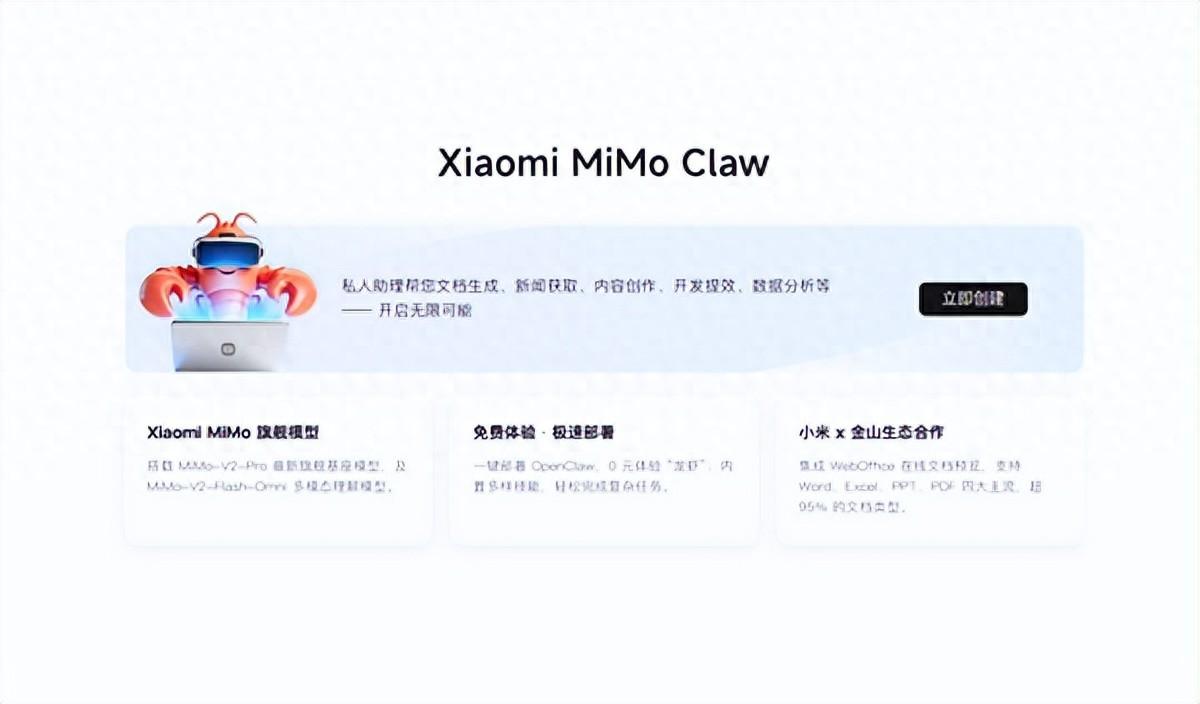 快科技3月19日消息,小米正式上線Xiaomi MiMo Claw平臺並開放免費體驗,該平臺依託小米最新大模型打造,實現一鍵部署OpenClaw(龍蝦)智能體,還深度集成金山WebOffice,打通AI智能體與辦公生態,讓AI從對話交互真正邁向自主執行,爲用戶帶來高效的智能辦公體驗。