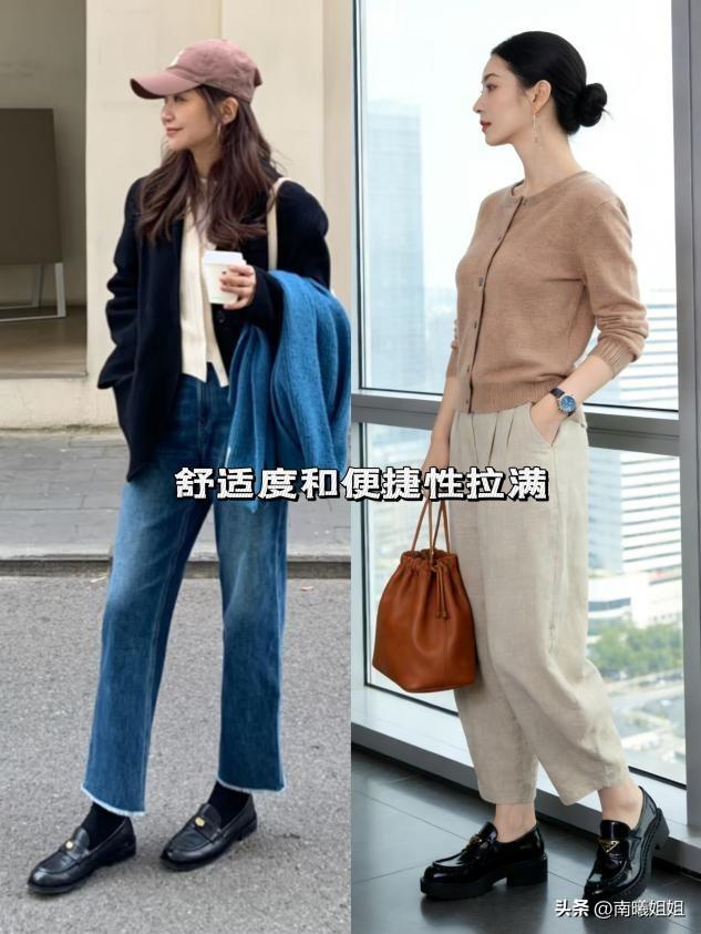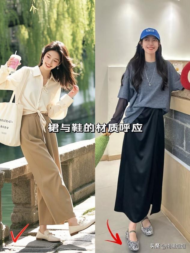不用一味追求同材質搭配,材質碰撞更顯時尚。軟皮樂福鞋搭配硬挺西裝料,德訓鞋搭配柔糯針織衫,瑪麗珍搭配順滑緞面裙,軟硬材質對比,讓簡約穿搭更有層次,細節感拉滿。
