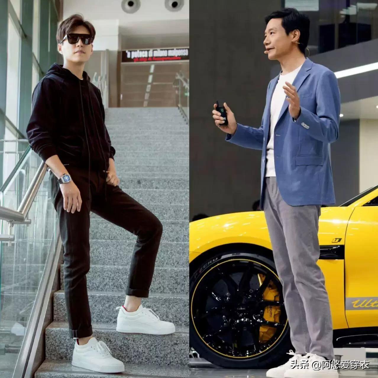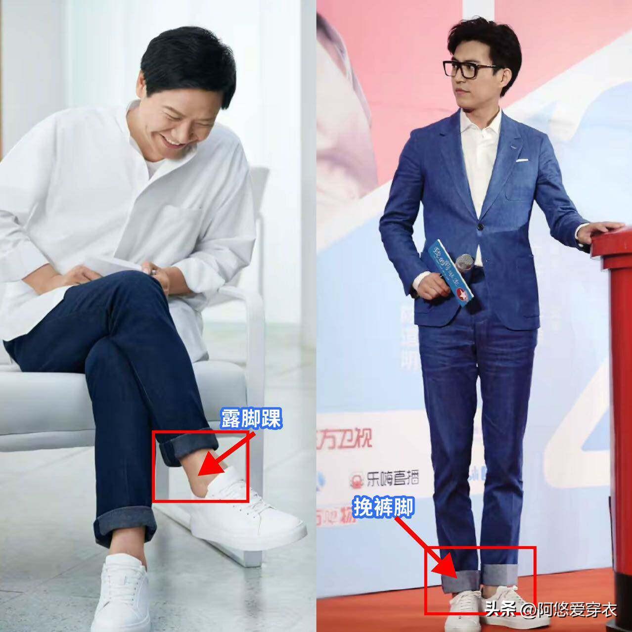 中年男人穿鞋,褲腿不要堆在鞋面上,尤其是很多比例差的男人,以爲穿的褲子長一點會顯得腿更長,結果反倒是顯得下半身很拖沓,我們可以穿這種九分的褲子或者把褲腳挽起來,剛好露出腳踝,哪怕是配一雙平底的小白鞋也可以顯高顯瘦。
