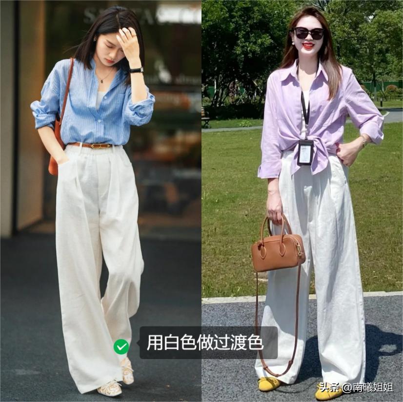 顏色上不建議大家搭配的過於雜亂,特別是這種經典色的闊腿褲,很適合搭配黑白色的上衣,基礎的配色相對於其他的色彩搭配而言,會更加的百搭,穿在身上會很利落,全身上下顏色不超過三種,自然而然就會顯得很高級。所以很多中年女人在穿闊腿褲的時候,通常會使用同色系的搭配原則。