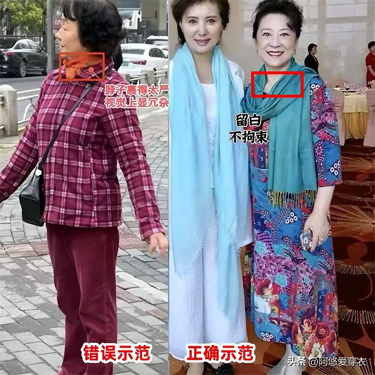 在戴絲巾的時候,中年女人也不能直接用絲巾緊緊包裹住脖子,這樣的系法會顯得特別的拘束,沒有留白的話更是會給人一種很臃腫沉悶的感覺,顯得脖子又短又粗,反倒是拉低氣質哦。