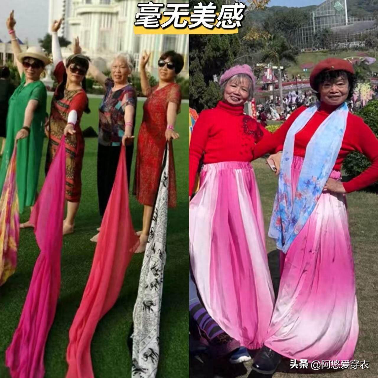 更可怕的是,這些大媽在披絲巾的時候,穿着打扮也很油膩,比如披着花絲巾還搭配墨鏡、老年帽,再穿一件設計花哨的衣服,整個人看着就像是行走的調色盤一樣,配飾之間的風格產生了強烈的衝突感,風格之間相互打架,顯得土氣還雜亂。