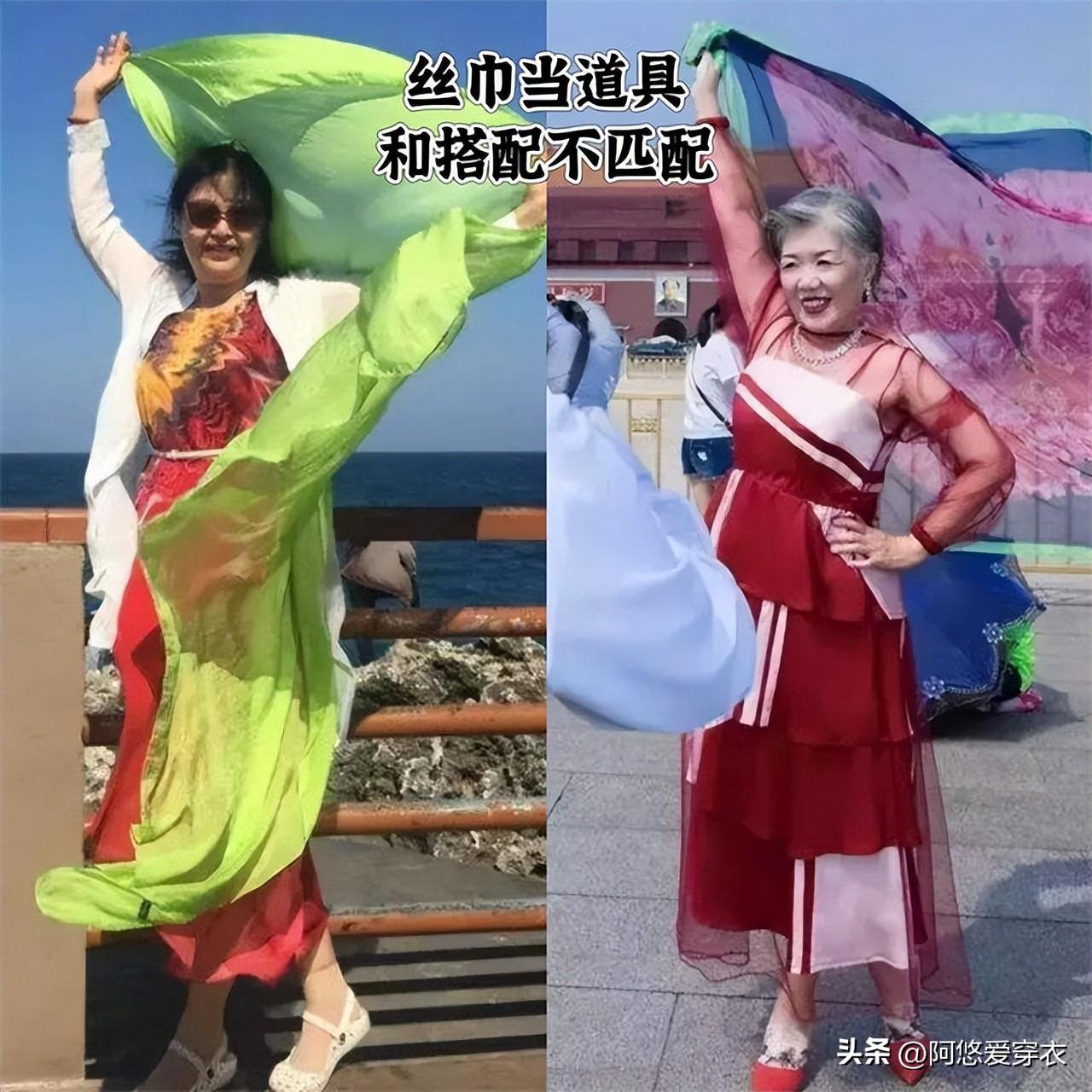 而且這些大媽們披絲巾的目的根本不是爲了提升造型的時尚感,只是爲了讓絲巾當做道具來豐富拍出來的照片,你看她們披絲巾的時候,幾乎都是用雙手把絲巾揮舞在天空中,姿勢浮誇、體態也很差,讓絲巾從時尚單品變成了“土味道具”,直接把高級感給削弱沒了。