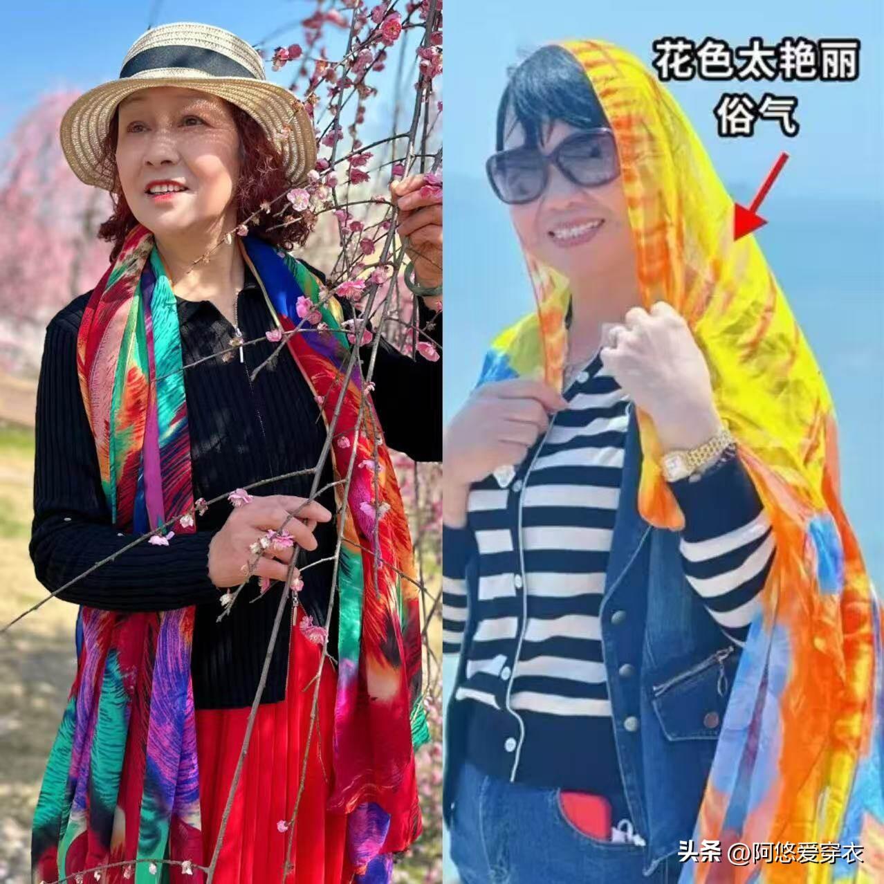 絲巾本身沒有錯,錯的是不會選,很多中年女人春遊時買了好多的絲巾,可細細一看,全都是廉價的聚酯纖維,輕薄沒有質感,披在肩膀上,直接把造型的高級感拉低了,顯得特別的廉價;而且這些大媽們的絲巾款式也很豔麗,都是飽和度高的紫色、橘色、紅色,真的不耐看,油膩的很。