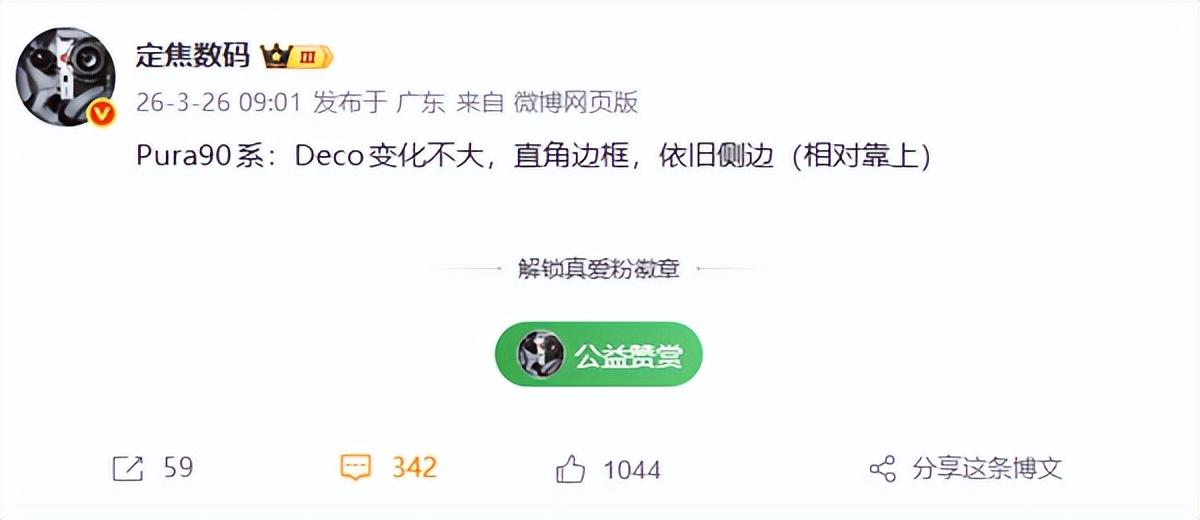 同時,另一位博主“定焦數碼”透露,Pura 90系列後攝模組變化不大,機身採用直角邊框設計,並配備側邊指紋識別方案,識別位置相對偏上。