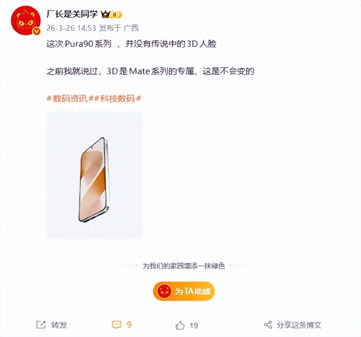 今日,博主“廠長是關同學”透露,華爲Pura 90系列依然不會搭載3D人臉識別功能,並表示該技術爲Mate系列專屬,這一產品策略不會發生改變。