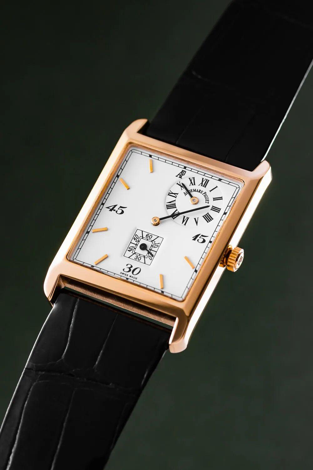 白金款式、長方形錶殼、鱷魚皮帶,設計帶有Art Deco風格,據說當年只生產了約2000只,蠻有收藏價值的。