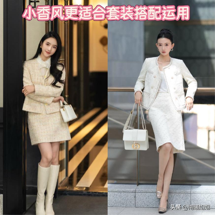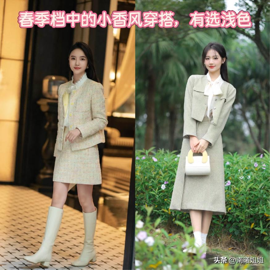 當下正是春季的階段,所以小香風的搭配不管是成套還是結合,更加極具高級優雅感的下半身單品來進行的組合,都最好可以優先於選擇淺色系列爲主整體展現出來的視覺,效果溫柔又優雅,而且又有減齡清新的襯托魅力!當然了,在一些比較正式的場合,想要襯托的更加急劇沉穩效果,那麼飽和度較低的一些彩色,或者是像黑灰這樣的顏色也可以放心運用。