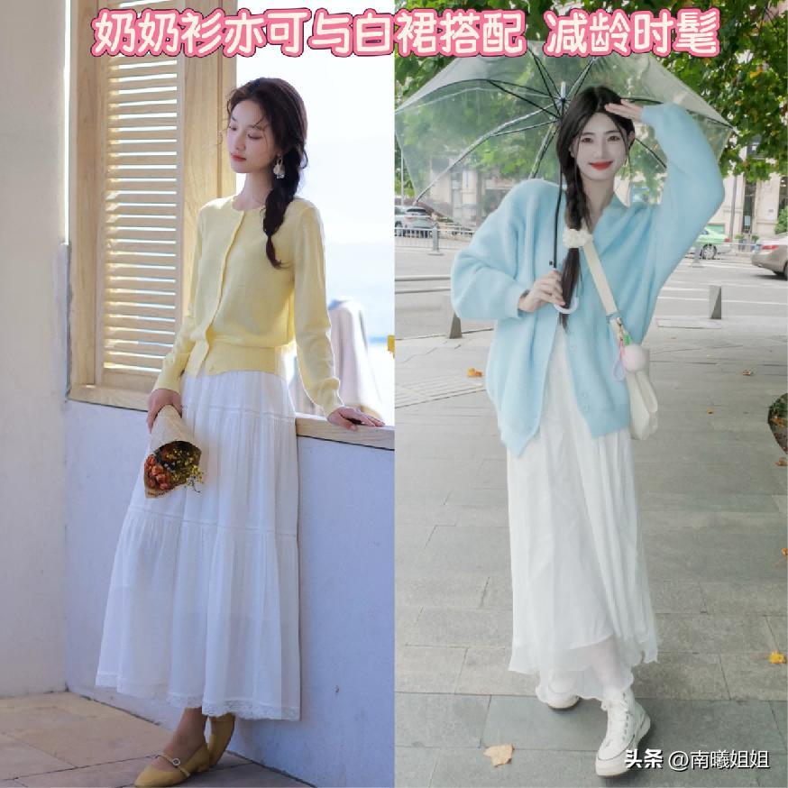 ① 奶奶衫搭配:白色裙子結合,減齡休閒