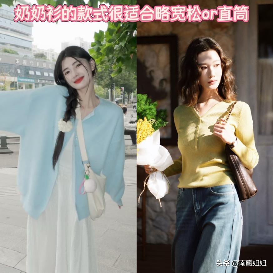 而奶奶衫這一款外套的搭配在更多的時候都推薦大家可以優先於選擇運用略微寬鬆的版型狀態,在視覺上而言更加的鬆弛自然,而且對於我們的身形狀態也有一定的包容性,第二種款式的話就是直筒的設計,如果你小贅肉比較多,或者是身形的線條不好看,那麼這樣的版型狀態會更加的展現視覺上的優勢點。