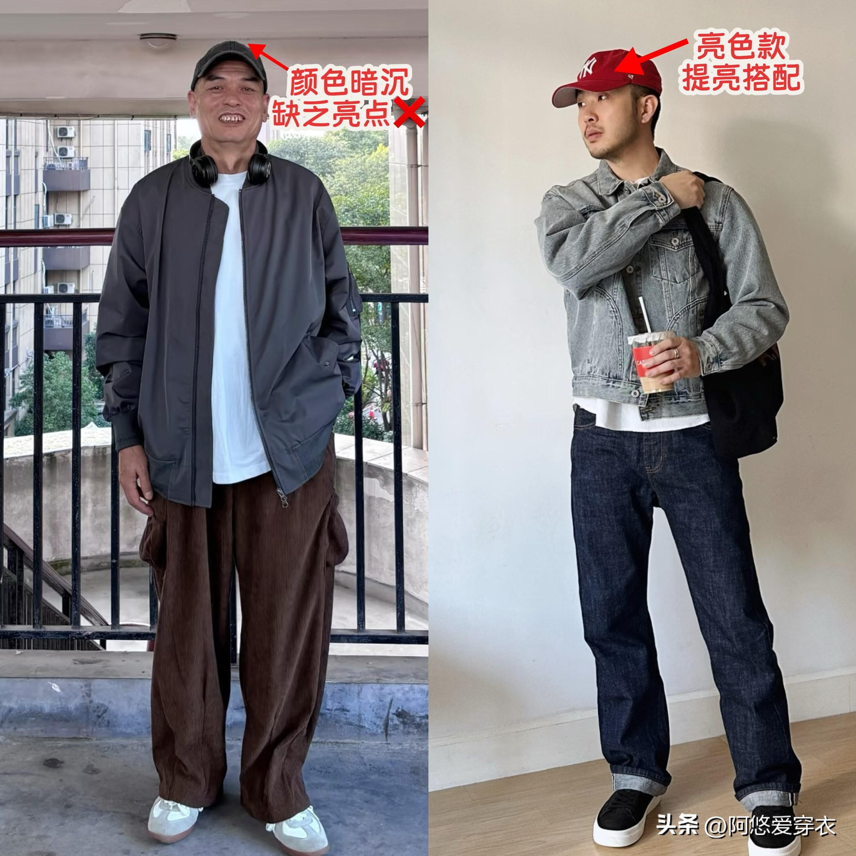 ②暗沉色衣服搭配亮色棒球帽,提亮造型