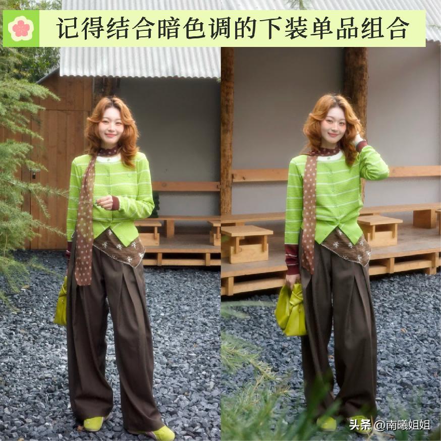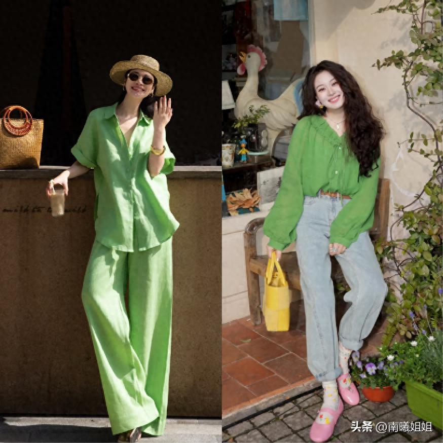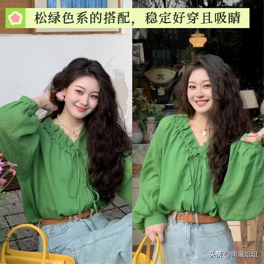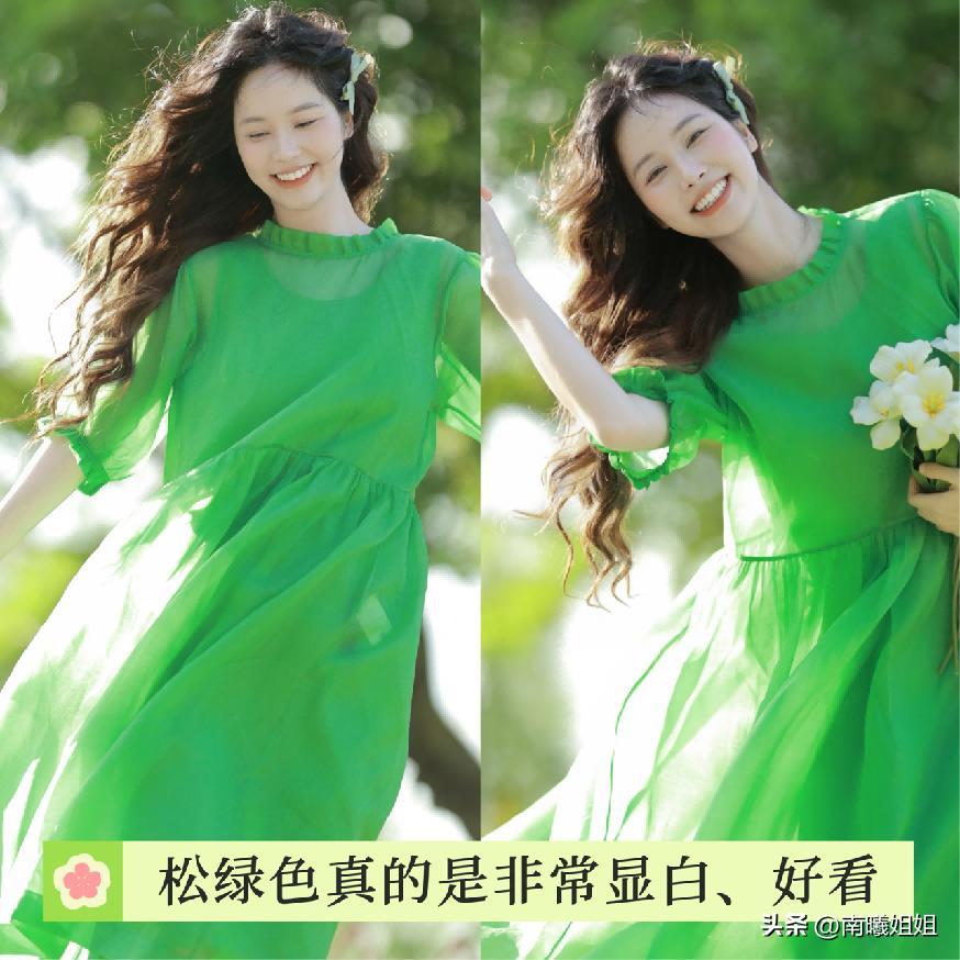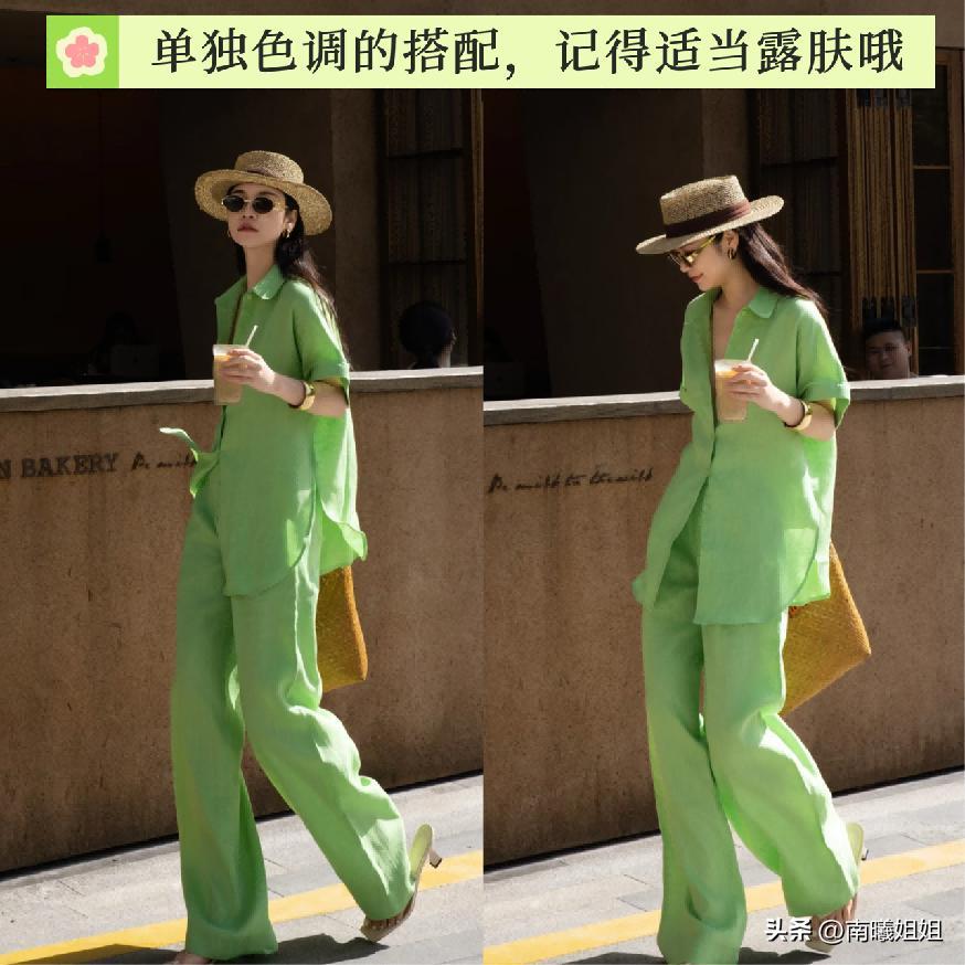 綠色調這一種顏色的搭配,其實還是難以駕馭的,尤其是對於黑黃皮的女性而言,像亮綠色或者是翠綠,穿起來的話就很容易顯黑,但是如果搭配松綠色的話,因爲其飽和度比較低一些,所以整體給人的感覺會更加的顯白,又有一定的清新感,不得不說,在每一年春夏季節的時候,像這樣的彩色調來進行搭配的話,在視覺上真的是屬於又獨特又好看。