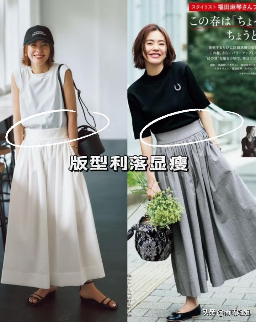 更難得的是,日本主婦的穿搭,非常注重“鬆緊結合”的原則,當下裝過於寬鬆時,上衣會選擇稍修身的款式;當上衣偏寬鬆時,下裝會選擇利落的直筒款,避免全身寬鬆顯得臃腫,也避免全身緊身暴露短板。