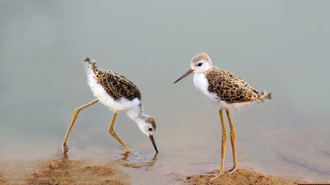 兩隻黑翅長腳鷸亞成鳥在淺水中覓食