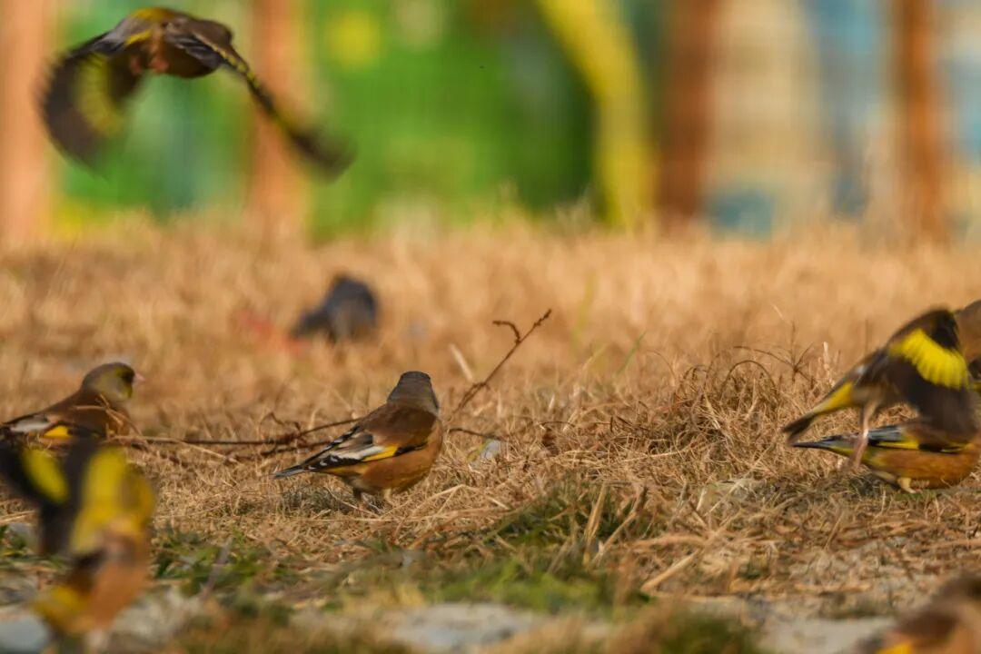 上圖:冬天公園剪了雜草,滿地草籽會引來大羣金翅雀和家麻雀,如果一直蹲伏,它們會慢慢靠近;
