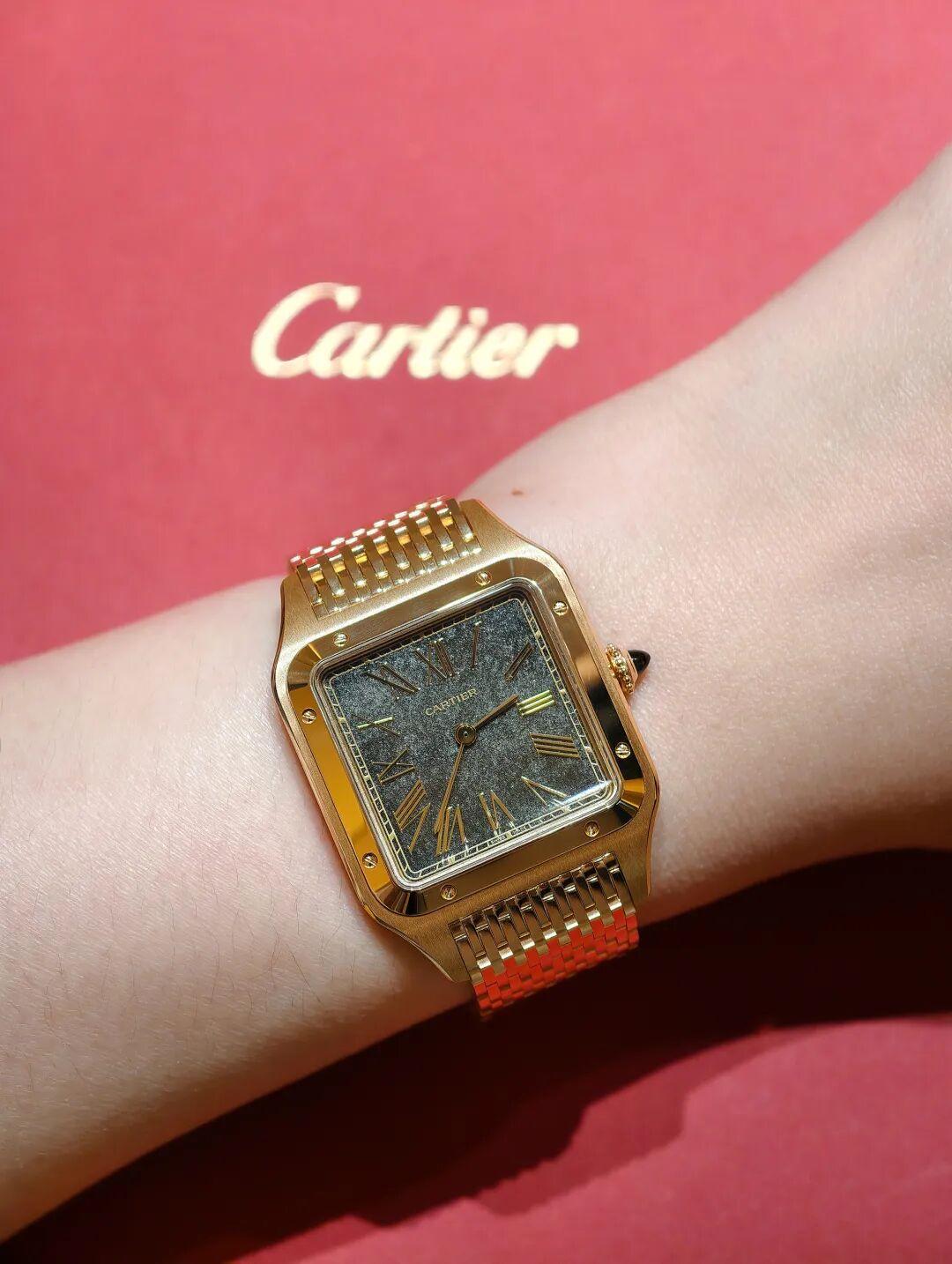 給我驚喜的還有Santos-Dumont腕錶。錶盤的金色黑曜石產自墨西哥火山岩裏藏着的微小氣泡,能反射出虹彩光澤,關鍵是厚度才0.3毫米,纖薄如玻璃。