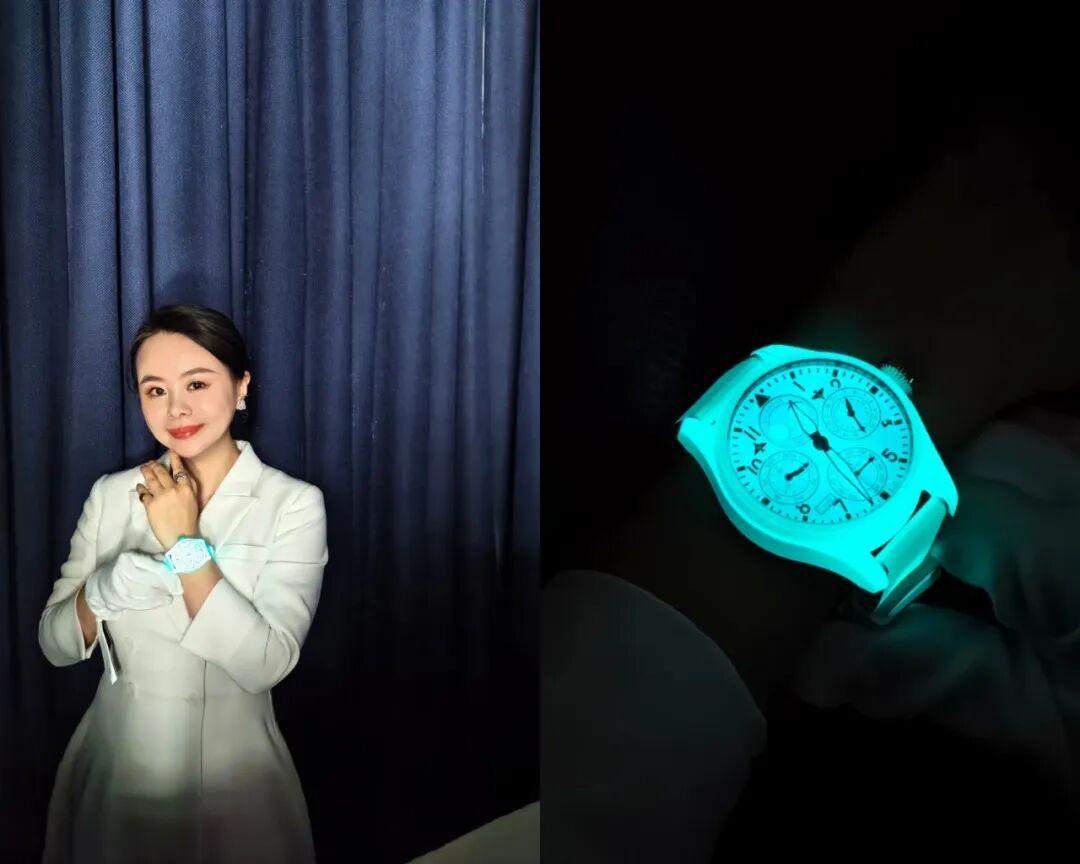 大飛CERALUME夜光瓷萬年曆特別“魔幻”,白天是低調的白灰色,一進黑暗整隻錶殼都會持續散發深邃明亮的幽藍光芒,背後則是萬國的材料黑科技。