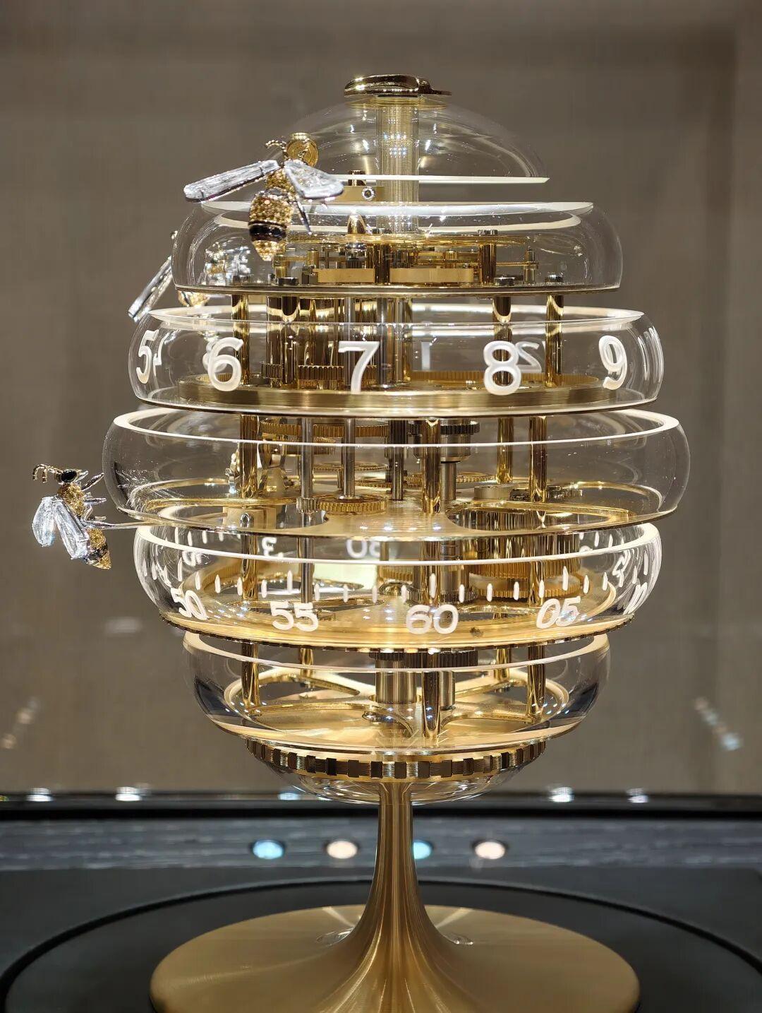 全球限量10座的“蜂巢座鐘”也讓人挪不開眼。這是蕭邦聯合知名工坊L''Épée 1839共同打造的機械藝術品。三隻鑲嵌着寶石的黃18K金小蜜蜂,在透明的弧形玻璃環間飛舞並指示時間,創意滿格。