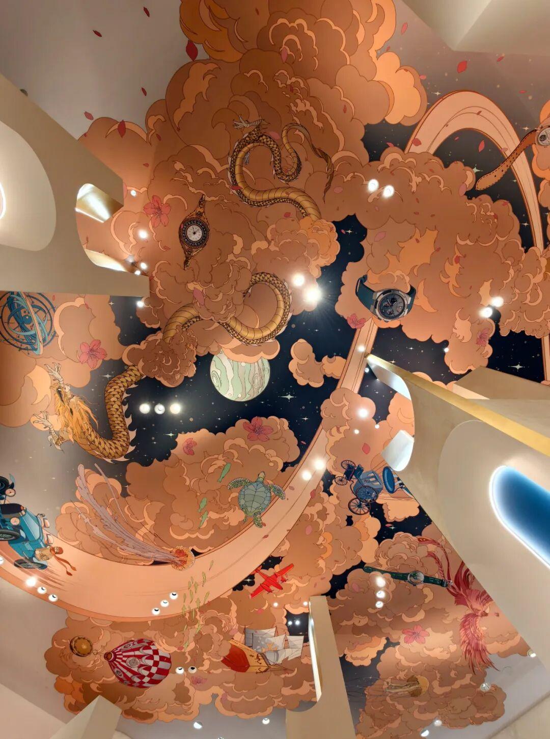 展館的設計,由品牌和上海藝術家江杉合作打造。抬頭看,橘金色雲朵在深藍星空中翻湧,金龍、鳳凰盤旋其間,熱氣球、復古賽車與老式飛機並行於同一片宇宙,幾枚縱橫四海腕錶像行星般懸在星雲之間。