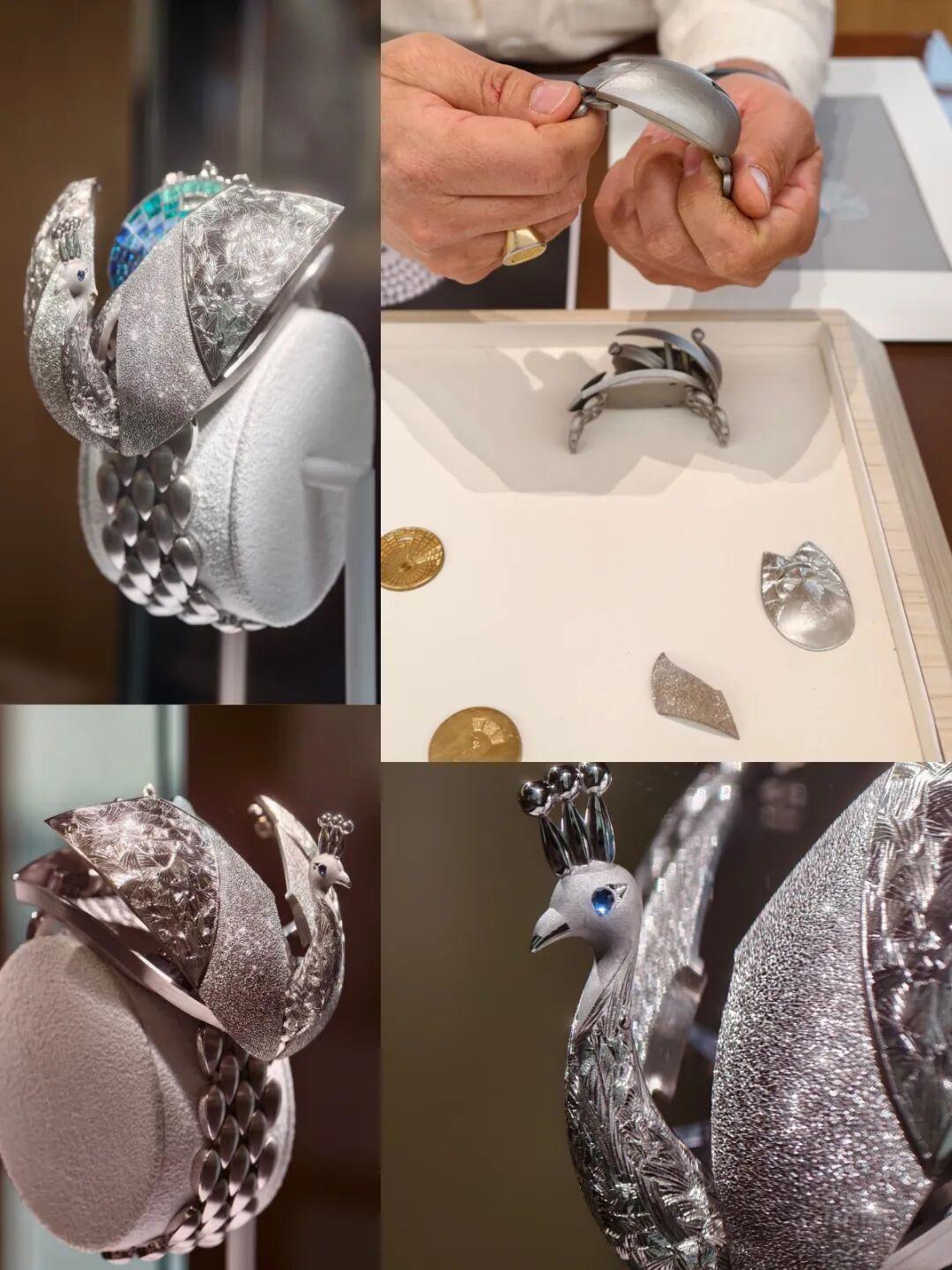 “雀影羽翎”更絕。輕輕一按,展開手工孔雀與琺琅錶盤,工藝複雜到驚歎。像極了藝術品~